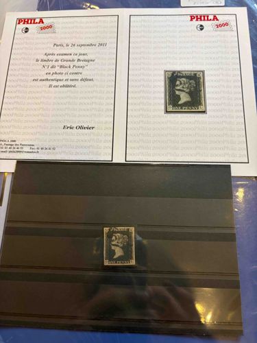 This item is an original 1840 Penny Black, the world's first adhesive postage stamp, accompanied by a certificate of authenticity from 'PHILA 2000' signed by Eric Olivier, dated September 26, 2011. The stamp features a profile portrait of Queen Victoria in black ink on white paper, which has aged to a cream/off-white tone. It is used (cancelled) as indicated by the French text 'Il est oblitéré' on the certificate. The stamp appears to have four clear margins, a highly desirable trait for collector value. It features the 'POSTAGE' header and 'ONE PENNY' footer common to this issue. The certificate provides a provenance and expert verification of the stamp's condition as 'sans défaut' (without fault), which is critical for high-end philatelic valuation. The stamp is presented in a protective black stock card mount beneath the certificate. The craftsmanship involves a fine steel plate engraving produced by Perkins, Bacon & Co. in London. The overall condition looks excellent for its age, showing no visible thins, tears, or significant staining beyond natural paper aging and the cancellation mark. The specific check letters at the bottom corners, used for security and identifying plate positions, appear to be 'L' and 'J' based on the certificate photo, though they are slightly obscured by the cancel.