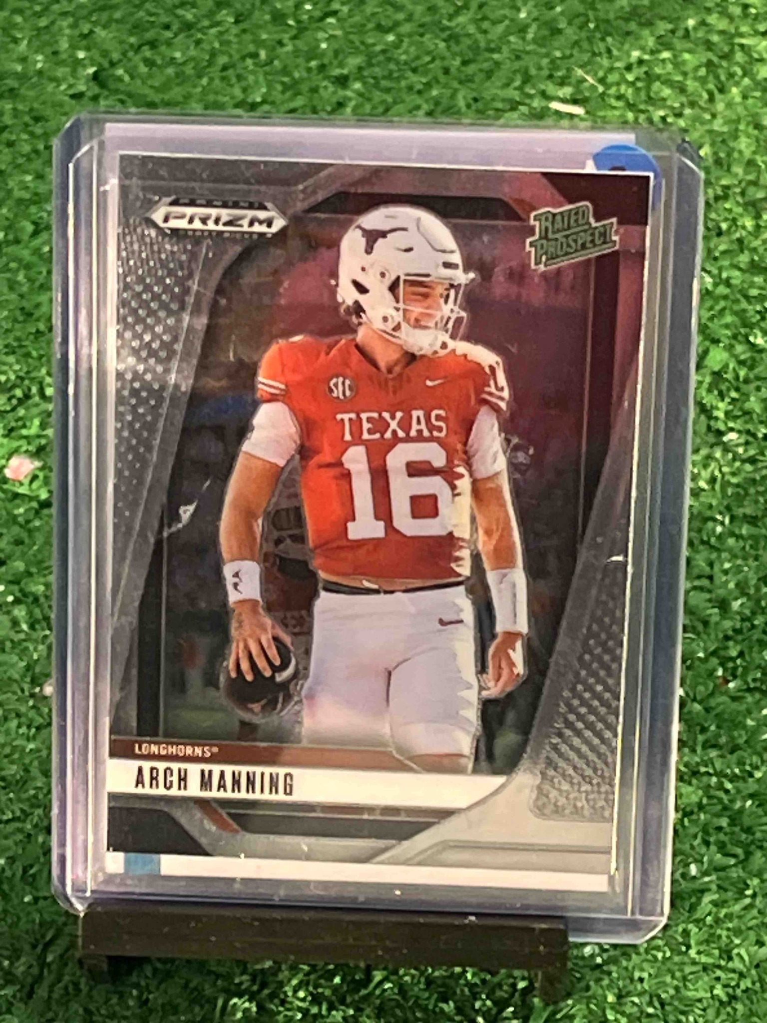 This is a modern sports trading card featuring Arch Manning of the Texas Longhorns, produced by Panini under their 'Prizm Draft Picks' line. Manning is depicted in his full orange and white Texas football uniform, wearing jersey number 16 and a white helmet with the iconic longhorn logo. The card utilizes Panini's signature Prizm technology, which features a metallic, chromium-style finish and a textured, dimpled background pattern on the silver borders. The top left corner displays the 'Prizm' logo, while the top right corner features a 'Rated Prospect' badge. The bottom of the card includes a white nameplate with 'ARCH MANNING' in black capital letters and 'LONGHORNS' in a smaller copper-toned font. The card is currently protected within a clear soft sleeve and a rigid plastic top loader. Based on visual inspection, the card appears to be in very good condition with sharp corners and clean edges, though absolute centering and surface integrity would require a high-resolution physical inspection for professional grading. The craftsmanship reflects modern high-end printing standards with vibrant color saturation and high-gloss finishes typical of the 2023-2024 production period.