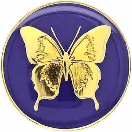 This is a circular lapel pin or medallion featuring a stylized gold-tone butterfly centerpiece set against a vibrant purple enamel background. The butterfly is rendered in a raised (bas-relief) metallic finish, likely brass or gold-plated zinc alloy, showing fine engraved details that define the wing patterns, antennae, and body segmentation. The construction follows a typical 'soft enamel' or 'hard enamel' process where the metal walls create a recessed area for the colored resin. The purple enamel is a deep violet hue with a smooth, glossy finish that contrasts sharply with the gold metallic elements. The item is bordered by a thin, polished gold-tone rim that encapsulates the enamel field. This style of pin is commonly used as a commemorative token, awareness symbol (frequently for lupus or fibromyalgia), or organizational insignia. Based on the clean lines and uniform color application, it appears to be a contemporary mass-produced item of modern manufacture (late 20th to 21st century). The condition appears excellent with no visible scuffing to the enamel, oxidation on the metal, or chipping. The craftsmanship shows high-quality die-striking, resulting in sharp, clear edges on the butterfly silhouette.