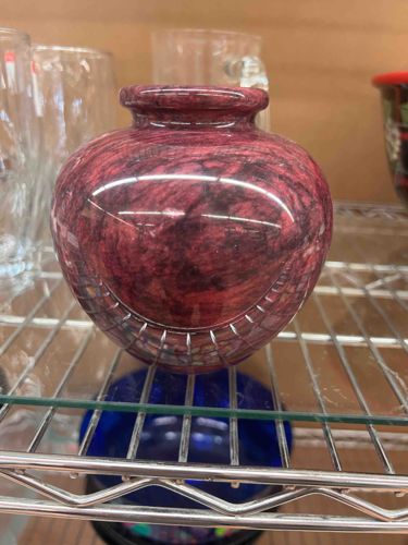 This item is a small, hand-blown or mold-blown art glass vase featuring a globular, squat body with a slightly flared, rimmed neck. The aesthetic is defined by a high-gloss finish and a dense, marbled pattern of deep magenta, plum, and burgundy swirls interspersed with darker, blackish-purple veining, suggesting either a glass-swirled 'end-of-day' technique or a deliberate cased-glass marble effect. From its proportions and the way the glass captures light, it appears to be a mid-to-late 20th-century decorative piece. The construction shows a smooth surface with no visible seams, indicating quality craftsmanship. While markings are not visible in the photo, the style is reminiscent of various Scandinavian or American art glass studios. The condition appears excellent with no visible chips, cracks, or significant abrasions on the body. Its rounded form and rich, jewel-toned color palette make it a distinctive piece for display or a small floral arrangement. The light reflections on the surface indicate a very high polish and a lack of surface oxidation.