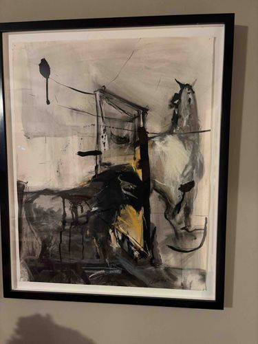 This original mixed media work on paper by contemporary artist Addison Hodges features a dynamic and abstract representation of equestrian forms. The composition is characterized by a high-contrast palette of charcoal black, stark white, and muted sepia tones, accented by a distinctive flash of yolk-yellow near the center. The artist utilizes energetic gestural brushwork, drips, and sharp linear elements that suggest movement and anatomical structure while leaning heavily into abstract expressionism. The piece is float-mounted within a deep-set black gallery frame with a white spacer, allowing the natural deckled or irregular edges of the heavy-weight paper support to be visible. Measuring approximately 18x24 inches (estimated based on frame scale), the artwork showcases several hallmarks of Hodges' style, including aggressive mark-making and an interplay between negative space and dense ink washes. A signature is discernible in the lower-right quadrant within the charcoal wash. Condition appears excellent, with the paper displaying no visible foxing, buckling, or UV degradation under its protective glazing. The framing is modern and minimalist, consistent with professional presentation from the late 20th to early 21st century. The craftsmanship is evident in the confident layering of media and the sophisticated balance of 'chaotic' elements into a cohesive, emotive equestrian study.