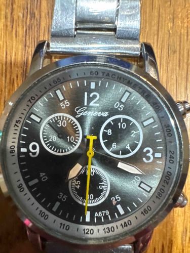 This is a fashion wristwatch featuring a circular silver-tone metal case and an integrated three-piece link oyster-style stainless steel bracelet. The watch features a dark charcoal or black sunburst dial with a three-register chronograph aesthetic. The dial is marked with the 'Geneva' cursive logo below the 12 o'clock position and the model number 'A679' at the bottom. The hour markers consist of bold Arabic numerals at 3, 9, and 12, interspersed with luminous white rectangular indices. A tachymeter scale appears on the outer rehaut. The handset includes silver-tone sword-shaped hour and minute hands with luminescent filling, contrasted by a vibrant yellow central second hand. While it mimics a chronograph, the three sub-dials (located at 3, 6, and 9 o'clock) are non-functional decorative elements printed on the dial, a common characteristic of mass-produced fashion watches from the early to mid-21st century. The condition shows significant signs of wear: a prominent vertical scratch is visible on the crystal extending from the 12 o'clock position down toward the center, and numerous surface micro-scratches and pockmarks are present on the bezel and lugs, indicating a plated base-metal construction rather than solid steel. The bracelet shows light scuffing and soil accumulation between the links. Two pushers are visible on the right side of the case, though they likely lack mechanical function. The watch operates on a standard battery-powered quartz movement.