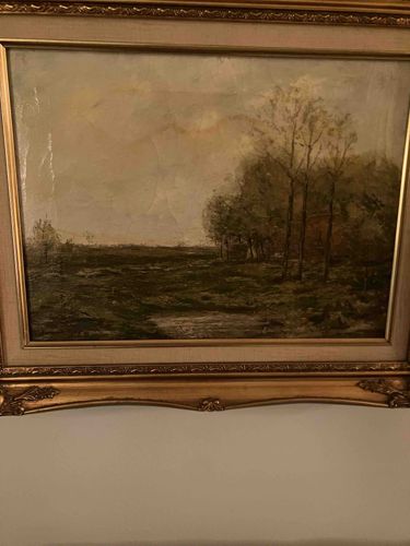 Framed Barbizon-Style Atmospheric Landscape Painting