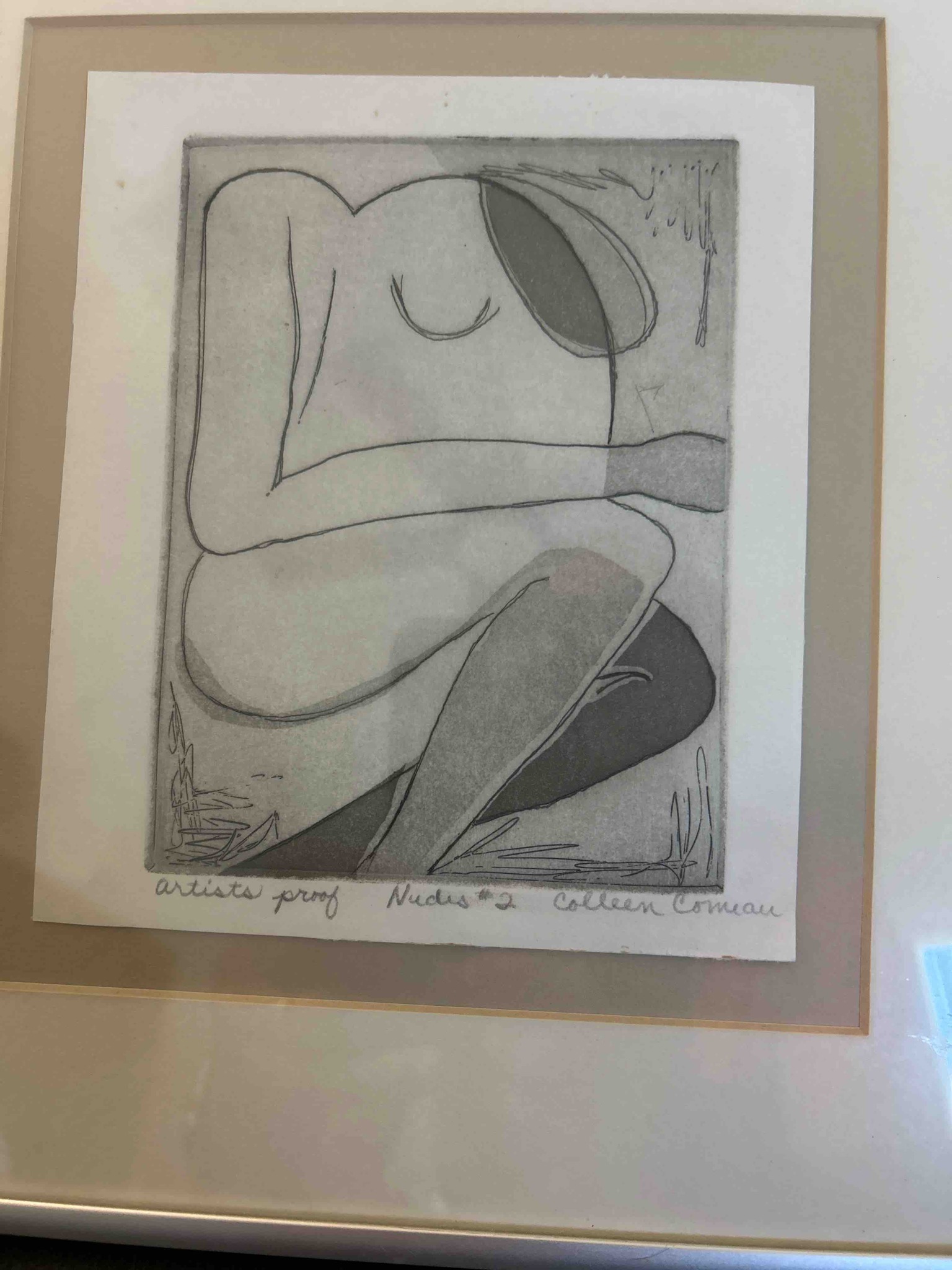 This item is an original intaglio print, specifically an aquatint etching, titled 'Nudes #2' by artist Colleen Comeau. The work depicts a stylized, minimalist female figure in a seated or crouching pose, rendered with clean linear contours and varying tonal grays achieved through aquatint shading. It is hand-signed by the artist in the lower right margin, titled in the center, and designated as an 'artists proof' (A/P) in the lower left, all written in graphite. The physical image exhibits clear plate marks where the metal plate was pressed into the heavyweight white paper, a hallmark of traditional printmaking. The composition shows mid-century modern influence with its abstracted, organic forms and limited monochromatic palette. Regarding condition, there is a visible brown spot (likely foxing or a localized stain) in the upper left margin of the paper, and slight yellowing along the edges consistent with age. The print is professionally matted in a tan/neutral mat and housed within a simple frame. Colleen Comeau was a Massachusetts-based printmaker known for her work in the mid-to-late 20th century. The craftsmanship is high, showing expert control over the etching bath to create even tonal gradations in the shaded areas, particularly in the lower leg and upper torso regions.