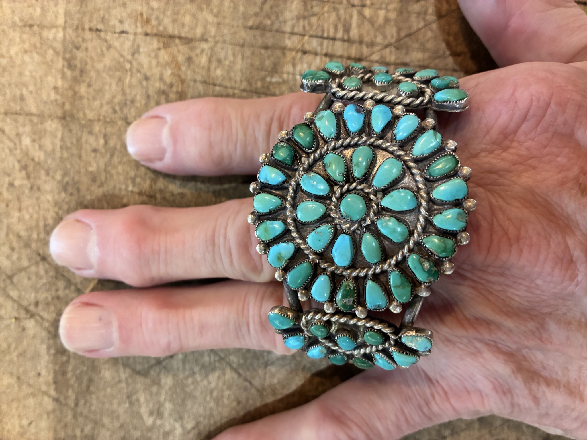 This is a significant Southwestern silver cuff bracelet featuring an elaborate 'cluster' or 'petit point' design, characteristic of Zuni craftsmanship. The central focal point is a large circular medallion composed of three concentric rings of hand-cut turquoise cabochons. The stones are teardrop and oval-shaped, finished with a smooth polish and set in individual serrated silver bezels. The turquoise exhibits a vibrant range of blue-to-green hues with subtle dark matrix inclusions, suggesting natural origin. The silverwork includes intricate twisted wire (rope) detailing between each row of stones and small silver granules (drops) flanking the outermost periphery. The cuff itself appears to be a multi-shank or 'split shank' construction to support the heavy weight of the central cluster. Smaller side clusters extend down the shoulders of the cuff to provide a seamless visual transition. Regarding condition, the piece shows a desirable heavy aged patina in the recessed areas of the silver, highlighting the depth of the metalwork. There is visible wear consistent with an antique or mid-century vintage piece (likely 1940s-1960s); some stones show slight surface variations and minor abrasions. No major cracks or missing stones are immediately apparent, indicating high-quality construction. The craftsmanship is refined, showing the precision required for traditional lapidary cluster work where each stone is individually fitted to its setting.