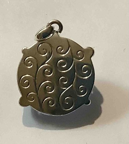 This item is a circular metal pendant, likely constructed from polished sterling silver or a high-quality costume metal with a rhodium or silver-tone finish. Size appears to be approximately 20-30mm in diameter, suitable for use on a necklace or charm bracelet. The face of the pendant features an intricate, deep-etched scroll or 'swirl' pattern reminiscent of classic filigree or Art Nouveau aesthetics, though the execution suggests contemporary mass production. The outer circumference is accented by four subtle, symmetrical protrusions or lobes, giving it a stylized, quatrefoil-influence silhouette. It is equipped with a simple jump ring and a teardrop-shaped bail at the top for attachment. The metal exhibits a high-polish reflective surface with minor surface abrasions and micro-scratches consistent with gentle handling or light wear. There is no visible maker's mark or hallmark on the front, suggesting any stamps for purity (such as .925) or brand identifiers would be located on the reverse or the bail. The craftsmanship is clean and uniform, characteristic of late 20th-century to early 21st-century jewelry manufacturing techniques.