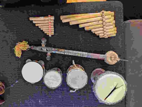 A diverse grouping of world folk musical instruments featuring two pan flutes (sikus), a long-necked stringed instrument (likely a Dotara or Ektara variant), and four assorted hand drums. The pan flutes are constructed from natural bamboo reed tubes of varying lengths, lashed together with fiber and decorative red bands; they show natural grain and organic texture. The stringed instrument features a long cylindrical neck adorned with colorful patterned wraps, possibly paper or textile, and includes large tuning pegs at the headstock and a circular resonator at the base made of wood or gourd. A vibrant yellow and orange textile tassel is attached to the head. The percussion section includes four small drums: one appears to be a tambourine with a white synthetic or skin head, others are traditional clay or wood-bodied hand drums with tension cords. The largest drum shows a significant crack across the drumhead membrane, indicating a loss of functional integrity. The overall condition suggests these are 20th-century artisan-made decorative or souvenir items from South Asian or Andean traditions, displaying significant wear, dust accumulation, and some structural damage to the percussion elements. The craftsmanship is rustic and functional for amateur play or display rather than professional orchestral use.