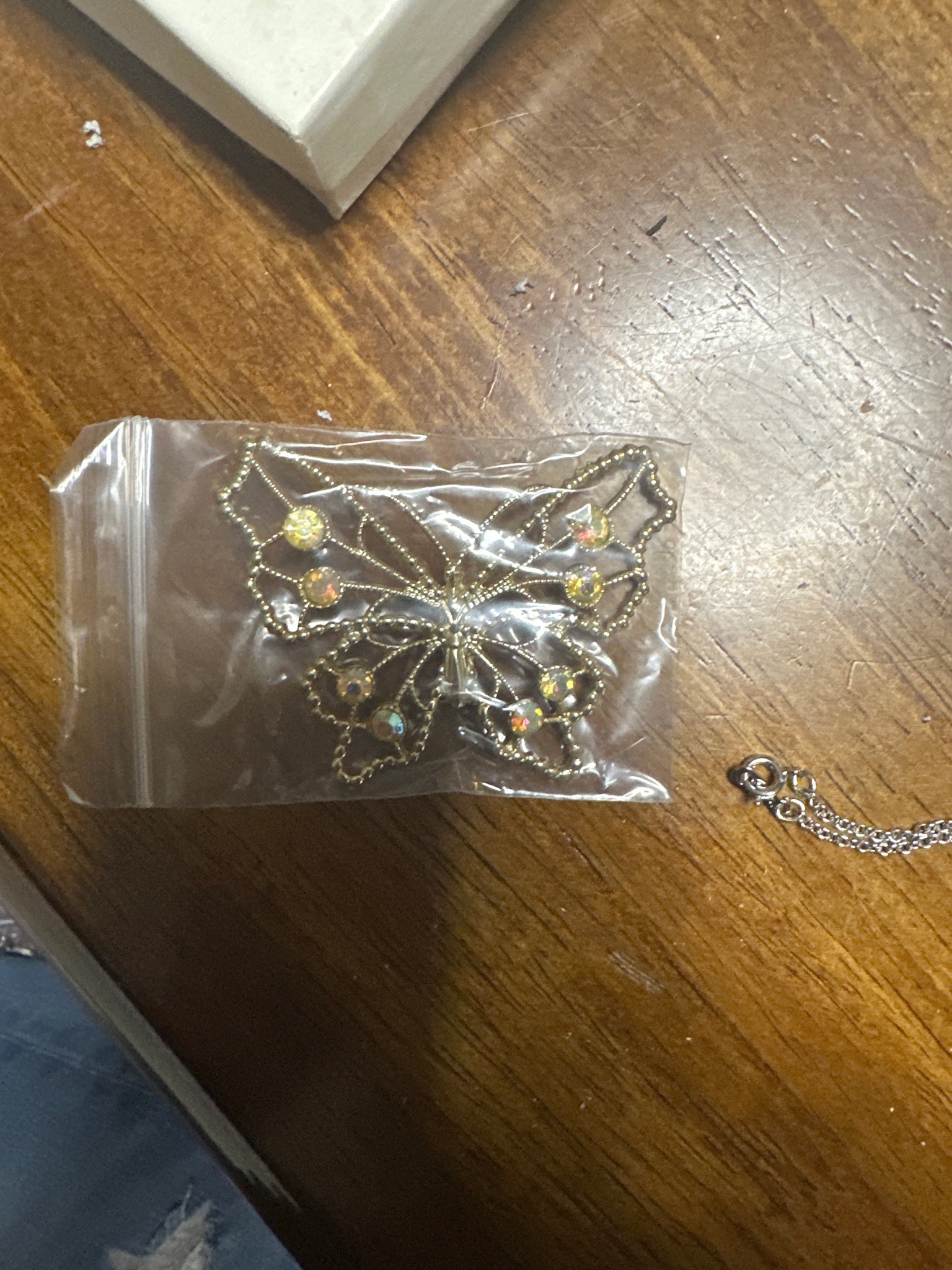 This item is a decorative butterfly-shaped piece, likely intended as a large pendant or a brooch, though the back is partially obscured by plastic packaging. The piece is constructed from a gold-toned metal filigree, featuring intricate beaded edging along the perimeter and inner wing veins. It is embellished with approximately eight iridescent aurora borealis (AB) rhinestones symmetrically placed across the wings. These stones exhibit a high-refraction coating that yields a spectrum of yellow, pink, and green hues when exposed to light. The craftsmanship suggests a mass-produced costume jewelry style, likely from the late 20th century to the present day. The metalwork appears to be a base metal alloy with a bright gold-colored plating. Physically, it measures roughly 2 to 3 inches in width. The condition appears to be excellent or near-new, as it remains housed in a small resealable plastic baggie, protecting it from surface scratches or environmental oxidation. No immediate signs of missing stones or broken metalwork are visible through the transparent film. There are no obvious maker's marks visible from the front view, signifying a typical fashion accessories piece found in contemporary retail or boutique environments.