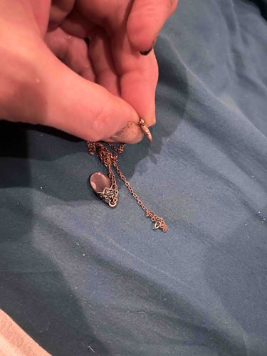 This item is a vintage-style pendant necklace featuring a central teardrop or oval-shaped translucent stone, likely rose quartz, characterized by its soft pink hue and cloudy clarity. The stone is held within an ornate decorative mounting at its base, which appears to be crafted from sterling silver or a base metal featuring an antiqued patina. This mounting is set with small, glittering dark stones, indicative of marcasite, arranged in a crown-like or floral pattern. The pendant is suspended from a delicate rose gold-tone cable chain, approximately 16 to 18 inches in length. The chain features a typical lobster claw clasp or small spring ring closure. The overall aesthetic suggests a late 20th-century reproduction of Art Deco or Victorian styles rather than a true period antique. The metal of the chain shows a reddish-copper luster, which may be rose gold plating over silver or brass. In terms of condition, the metal mounting shows some darkening consistent with intentional oxidation for style, though the chain appears slightly tangled. There are no immediate visible maker's marks, though such items are frequently stamped '925' on the clasp or the back of the pendant mounting. The craftsmanship is of a commercial decorative quality, typical of mass-produced boutique jewelry meant for everyday wear.