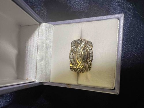 This is a substantial wide-band fashion ring featuring a complex crossover or 'woven' design aesthetic typical of late 20th-century luxury jewelry. The piece is crafted in yellow gold, likely 14k or 18k, and is heavily encrusted with two distinct styles of diamond cuts. The central interlacing bands are channel-set with graduated baguette-cut diamonds, providing a sleek, linear brilliance. These are flanked by undulating outer borders grain-set with round brilliant-cut diamonds, creating a textural contrast in light reflection. The construction demonstrates high-level pavé and channel setting skills, as the stones flow seamlessly across the curved architecture of the multi-row shank. Regarding condition, the metal shows a soft patina consistent with light wear, but the stones appear securely set with no obvious chips or missing facets visible. The style is reminiscent of the bold 'cocktail' jewelry popular in the 1980s and 1990s, characterized by high-volume metalwork and a dense concentration of melee diamonds. Although hallmark stamps are not visible in this orientation, the complexity and weight of the setting suggest a fine jewelry quality intended for formal wear. The ring is presented in a light purple hinged presentation box with a white satin-lined interior.