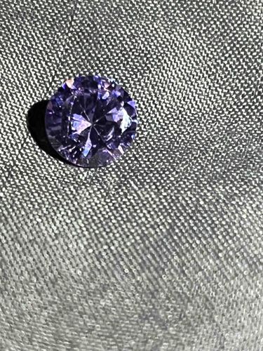 A single, loose gemstone featuring a round brilliant cut with a vibrant violet to lavender hue. The stone is meticulously faceted, showing a high degree of vitreous luster and significant light performance (scintillation). Based on visual characteristics, the gem exhibits the color profile consistent with natural amethyst, violet sapphire, or potentially a high-quality synthetic such as Cubic Zirconia or glass. The table facet is large and well-centered, while the crown facets appear sharp, meeting accurately at the junctions, which indicates professional lapidary work. The color appears largely uniform throughout the stone, though there are subtle variations in light and dark purple as facets reflect the light source. Under direct overhead lighting, the stone casts a distinct shadow to the left, which can be used to estimate its depth and pavilion angle. The condition appears to be excellent with no visible chips, abrasions, or nicks to the girdle or facet edges. There are no obvious inclusions visible to the naked eye, suggesting a clarity grade of 'eye-clean' or better. The stone is set against a textured grey woven fabric background, highlighting its transparency and brilliance. Without professional refractometer testing, it is difficult to confirm the exact mineral species, but its craftsmanship and color saturation suggest it is intended for fine jewelry use.