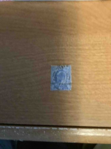 This item is a used British definitive postage stamp featuring the profile portrait of King George V. The stamp is printed in a blue/dull blue ink on paper, consistent with early 20th-century philatelic materials. The design includes a left-facing profile of the monarch enclosed in an oval frame, flanked by ornate scrollwork and botanical motifs. Physically, the stamp exhibits unevenly perforated edges, which is typical for stamps of this era that were separated by hand. A visible black ink cancellation mark or overprint is present across the lower third of the face, indicating it was likely postally used or officially overprinted for a specific territory. The condition appears fair to poor; there is significant blurring of the detail due to image quality, but visible wear is present on the edges, and the top right corner appears slightly damaged or folded. The stamp likely dates between 1911 and 1936, the period of George V's reign. The craftsmanship reflects the intaglio or typography printing methods of the Royal Mail's contractors during that period, such as Harrison & Sons or Waterlow & Sons.