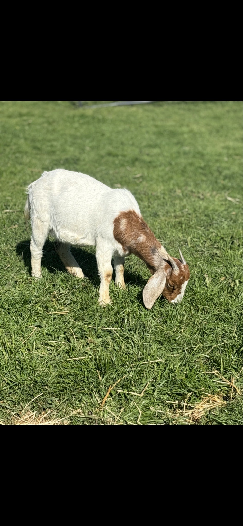 This specimen is a juvenile domestic goat, likely a Boer cross, exhibiting the characteristic bi-color pattern of a white body with a reddish-brown (cape) head and neck. Physically, the animal displays a sturdy, meat-type conformation with a thick, short-haired coat. Notable features include long, pendulous ears typical of the Nubian influence often found in domestic crossbreeds, and small, emerging horns indicating its young age. The coloration on the head includes a white blaze on the face and some mottling of brown and white. In terms of condition, the animal appears healthy and well-nourished, showing no visible signs of lameness or hair loss, though minor grass and soil staining is present on the lower legs and hooves consistent with an outdoor pasture environment. The craftsmanship of the 'item' is biological, showing good muscle development and a clean dorsal line. Its posture while grazing suggests good mobility and vitality. This specimen represents a contemporary livestock breed valued for both agricultural production and as a hobby farm animal, showing clear indicators of quality breeding through its symmetrical markings and robust frame.
