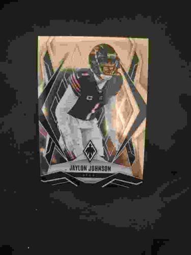 This is a standard-sized modern sports trading card (approximately 2.5 by 3.5 inches) featuring Chicago Bears cornerback Jaylon Johnson. The card is part of the Panini Phoenix football series, characterized by its distinct multi-layered, geometric design and high-gloss Optichrome finish. The central imagery depicts Johnson in his professional Bears uniform, positioned against a dynamic background of sharp, angular patterns and bronze/copper metallic accents. The player's name, 'JAYLON JOHNSON,' and team, 'BEARS,' are clearly printed at the bottom on a geometric nameplate. The Phoenix logo is prominently displayed above the nameplate. This specific card appears to be a parallel version, likely a 'Copper' or 'Bronze' Refractor, given the warm metallic hues reflecting across the surface. Regarding condition, while the image resolution is low, the corners appear relatively sharp with minimal visible edge wear. There are no obvious signs of surface scratching or creasing from this vantage point. Panini cards from this era are known for their high-quality thick cardstock and premium printing technology, which creates a significant refractive shine when tilted under light. The card represents a modern era of sports collectibles, likely from the early 2020s (specifically 2020, Johnson's rookie year, or a subsequent season).