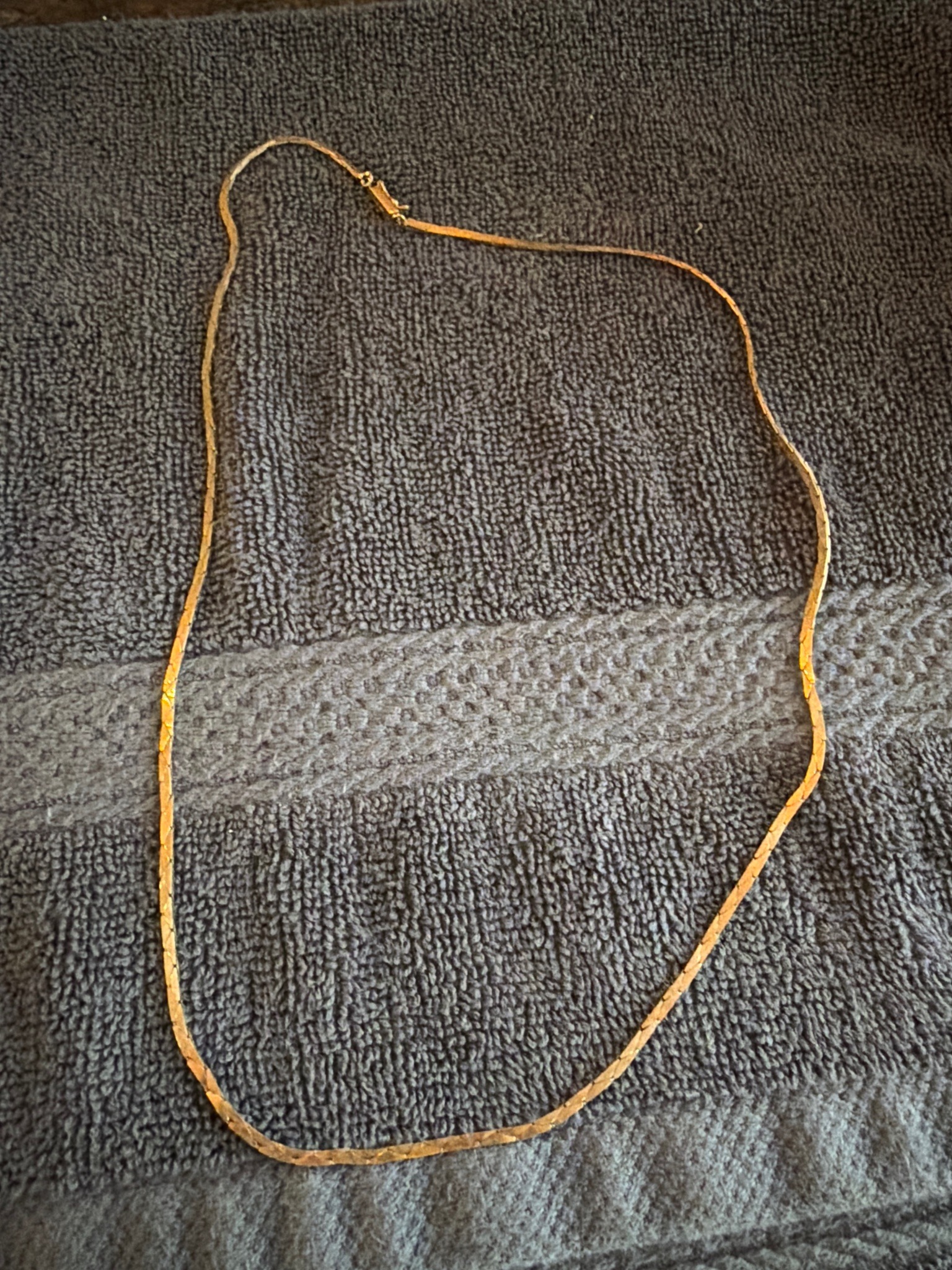 This item is a length of yellow gold jewelry, identified as a classic herringbone link chain necklace. The construction features flat, scale-like metal links that are slanted and tightly interwoven to create a smooth, ribbon-like appearance. The chain exhibits a high-polish finish, which reflects light to create a shimmering effect across its surface. In terms of physical characteristics, the chain appears to be approximately 18 to 20 inches in length with a relatively narrow width (estimated between 2mm to 3mm). The color is a consistent, rich yellow typical of high-karat gold or quality plating. The closure mechanism is a lobster claw clasp, which is preferred for security and durability. Upon close inspection, the chain shows slight kinking or warping in specific sections—a common condition issue with herringbone styles, as the delicate link structure is prone to permanent creasing if bent beyond its natural flexibility. There are no clearly visible maker's marks or karat stamps at this distance, though they would typically be found on the end tabs near the clasp. The style is classic and suggests a manufacturing period ranging from the 1980s to the present. The overall craftsmanship appears fine, with a flush, seamless alignment of the links, though the visible bends suggest it has been worn and handled.