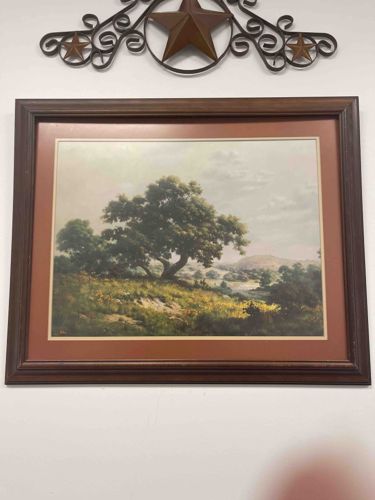 This item is a framed landscape print, typical of the mid-20th-century Texas Hill Country style popularized by artist Porfirio Salinas. The central subject features a large, gnarled live oak tree situated on a grassy hillside, surrounded by smaller vegetation and rolling hills in the background under an overcast sky. The color palette is composed of naturalistic greens, ochre yellows for the grass, and muted greys and blues in the sky. It is housed in a dark-stained wood frame with traditional molding. The print is professionally matted with a dual-color scheme: a thin cream-colored inner mat and a wider terracotta-colored outer mat. Based on the owner's provenance, the print dates to at least 1976, though the style suggests a production date between the 1960s and early 1970s. The condition appears fair for its age, showing some signs of slight color fading from light exposure and minor scuffing on the wooden frame edges. The craftsmanship is indicative of high-quality lithographic printing from the era, meant for home decor. A small, indistinct signature is visible in the lower-left corner of the image, consistent with Salinas's branding on mass-produced prints of the period.
