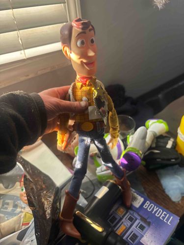 This item is a 12-inch scale talking Woody the Cowboy action figure from the Disney Pixar Toy Story franchise. The figure features a hard molded plastic head with sculpted brown hair, a soft plush fabric torso, and posable limbs. Woody is dressed in his iconic western attire, including a yellow checkered long-sleeve shirt with fabric buttons, a cow-print vest with a metallic-effect plastic sheriff's badge, blue denim-style fabric pants, and brown molded plastic cowboy boots. The construction includes a pull-string mechanism on the back, which is characteristic of the character's design from the films. In terms of condition, the figure shows heavy signs of play and age, including significant surface dust, dirt accumulation on the fabric limbs, and visible scuffing/paint loss on the molded hair and facial features. The metallic finish on the sheriff's badge appears worn. The fabric components exhibit pilling and discoloration. This specific model appears to be an early 2000s mass-market release, likely from manufacturers such as Thinkway Toys or Mattel. The heavy patina of use suggests it was a well-loved toy rather than a preserved collector's piece. The craftsmanship reflects commercial standard toy production from the late 20th and early 21st century.