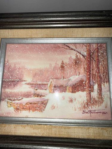 This item is an original watercolor painting on paper depicting a serene winter landscape. The artwork features a log cabin nestled beside a partially frozen body of water during a snowfall, executed with a soft, monochromatic palette of reddish-brown, pink, and white tones. The composition includes tall deciduous trees to the right and a snow-covered boat in the lower-left foreground, creating a sense of depth and rustic tranquility. Notable for its delicate application of white pigment to simulate falling snow, the piece is signed 'Jim Knutson' and dated '86' in the lower-right corner. The painting is housed in a triple-layered presentation consisting of a narrow silver-toned metal inner frame, a textured tan burlap or linen mat, and a dark brown wooden outer frame with a molded profile. The craftsmanship reflects late 20th-century regional American landscape art. In terms of condition, there is visible moisture staining or foxing along the bottom edge of the linen matting, which may indicate past exposure to humidity. The artwork itself appears relatively well-preserved behind glass, though the glare and slight discoloration on the matting suggest it should be inspected for acid-free materials to ensure long-term preservation.