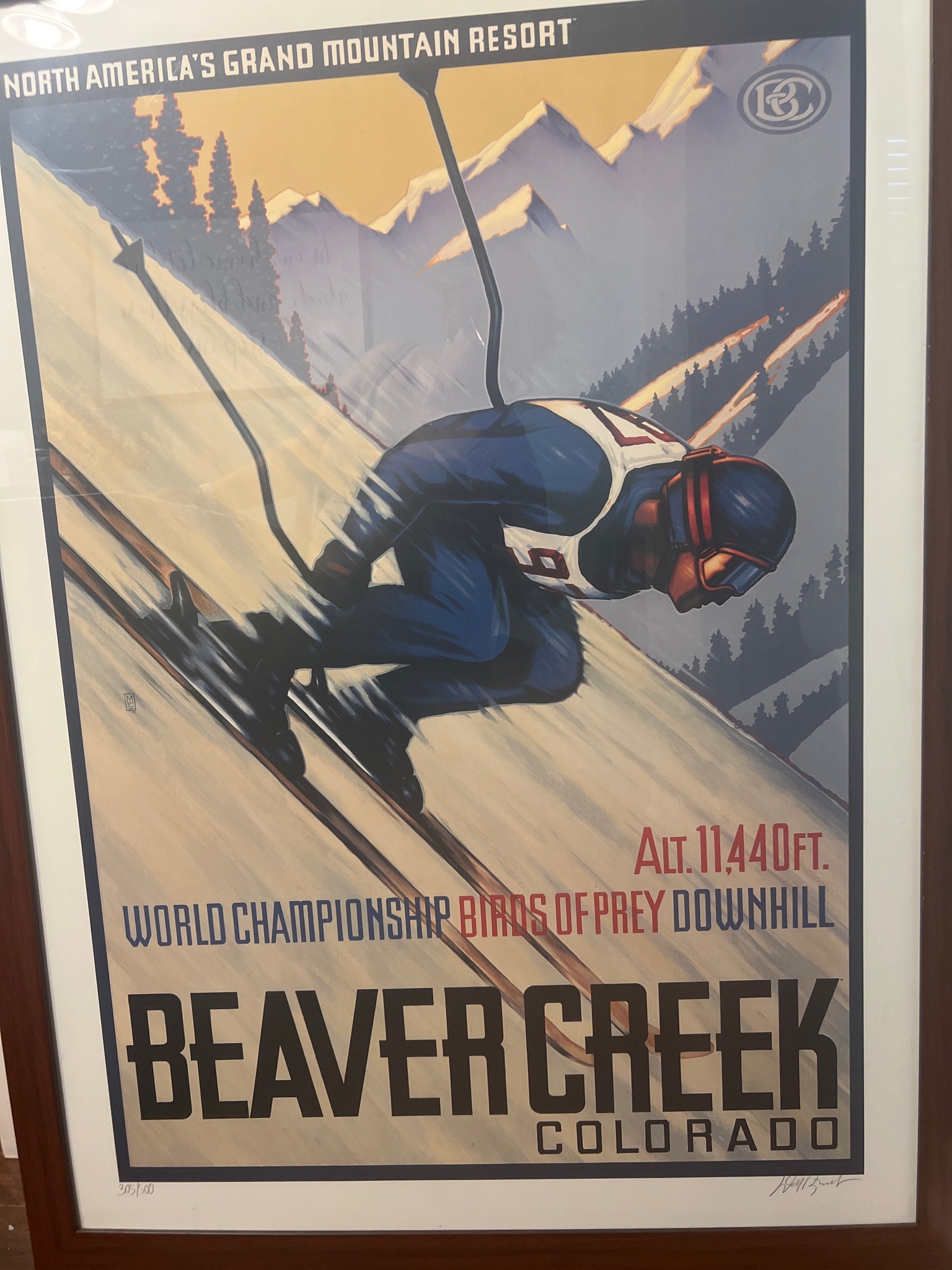 This is a large-format illustrative poster commemorating the Birds of Prey Downhill World Championship at Beaver Creek, Colorado. Executed in a vintage Art Deco style, the graphics feature a dynamic downhill skier in a deep tuck against a mountainous backdrop. The color palette utilizes muted blues, tans, and creams with bold red accents for the text. The composition is highly stylized with strong diagonal lines conveying a sense of speed. Physically, the piece appears to be a high-quality lithograph or serigraph print on heavy paper stock, housed behind glass in a dark wood frame with a white mat. A notable feature is the pencil numbering in the lower-left corner (305/500), indicating it is a limited edition, accompanied by a pencil signature in the lower-right, likely by the artist. The poster includes the Beaver Creek Resort logo at the top right and specific branding for 'North America's Grand Mountain Resort' at the top. The condition appears excellent with no visible foxing, tearing, or light-fading, though there is a slight reflection on the glass from the photo capture. The modern vintage-revival aesthetic suggests a late 20th to early 21st-century production date. The craftsmanship is professional, with crisp typography and smooth gradient transitions in the sky and snow.