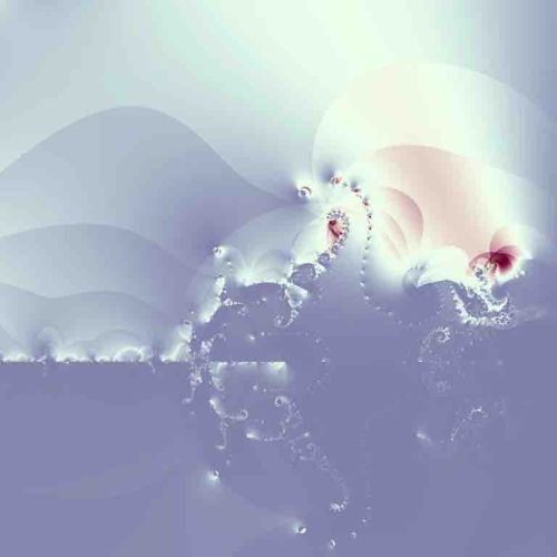 This item is a contemporary digital fractal artwork titled 'Shangri-La,' presented as a high-resolution digital file (TIFF format) capable of printing at dimensions up to 33x33 inches without distortion. The composition is a sophisticated example of generative art, featuring a complex, self-similar fractal geometry that suggests a serene, ethereal landscape. The color palette is dominated by soft, cool tones including muted lavender, smoky periwinkle, and pale iridescent blues, contrasted by delicate highlights of warm salmon and deep crimson in the upper right quadrant. The visual structure is divided by an organic horizon line where intricate, lace-like patterns emerge, resembling crystalline formations or mountainous ridges reflected in a still body of water. The craftsmanship is evidenced by the seamless gradients and the microscopic level of detail inherent in fractal mathematics, producing a 'infinite' depth that remains sharp and clean. There are no visible condition issues such as pixelation or compression artifacts, indicating a high-quality original digital render. The style is transcendental abstract, typical of late 20th to early 21st-century digital art movements, emphasizing mathematical beauty and mystical themes.