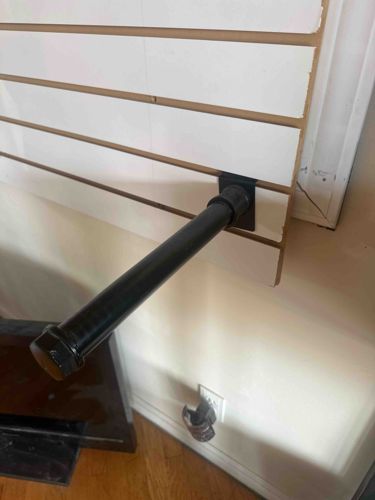 This item is an industrial-style display faceout specifically designed for use with slatwall systems, commonly found in retail environments. The bracket is constructed from heavy-duty steel piping with a matte black powder-coated finish. It features a rectangular slatwall backplate that hooks into a standard groove, supporting a protruding straight arm composed of a horizontal pipe section and a decorative end cap. The construction utilizes threaded pipe fittings, giving it a modern, 'industrial chic' or 'steampunk' aesthetic typical of early 21st-century retail design. The finish appears generally intact, though minor scuffing or paint loss may be present at the friction points of the backplate. The craftsmanship is utilitarian and robust, designed to hold significant weight from garments or displayed merchandise. No distinct maker's marks are visible, suggesting mass production. It is approximately 12 to 16 inches in length, utilizing standard 1-inch or 3/4-inch diameter piping components. The item is in good functional condition with no visible structural deformation or rust.