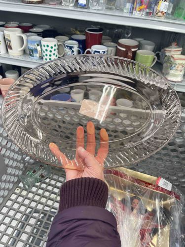 This is an oval serving platter made of tempered opalescent glass, specifically in the 'Rosaline' pink colorway produced by the French glass manufacturer Arcoroc (J.G. Durand/Luminarc). The platter features a signature wide, scalloped rim with a spiral or radial 'swirl' pattern that catches the light, while the center is smooth and flat. The material is a light, translucent salmon or peachy-pink glass that was highly popular in the 1980s and 1990s. In terms of size, it appears to be approximately 12 to 14 inches in length based on scale relative to the person's hand. The glass is known for its durability and heat resistance. Notable markings include a partial white adhesive sticker on the surface, which likely obscures a maker's mark or price code. The condition appears sound with no visible chips or deep cracks, though the surface shows light smudging and residues typical of items found in a secondary market setting. The craftsmanship is consistent with industrial mid-to-late 20th-century European glassware, characterized by clean molded edges and a consistent color saturation throughout the piece.