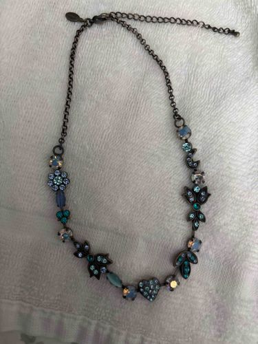 This is a contemporary costume jewelry necklace featuring an asymmetrical arrangement of charms set on a dark, gunmetal-tone or oxidized silvertone chain. The piece is constructed with a rolo-style chain and includes an adjustable extender section with a small tear-drop shaped brand tag, characteristic of the retailer Chico's. The decorative focal section includes various shapes: a crystalline flower, a heart pavé-set with teal stones, leaf-like clusters, and several circular bezel-set crystals in iridescent Aurora Borealis and pale blue finishes. The color palette is dominated by cool tones, including teal, navy, and sky blue glass crystals or rhinestones. The metal finish shows a deliberate darkened patina to enhance the vintage-inspired aesthetic. The condition appears excellent with all stones intact and minimal visible wear to the plating. The craftsmanship is typical of high-end mass-market fashion jewelry, utilizing prong and bezel settings to secure the varied stones. It likely dates from the 2010s to the present, reflecting a whimsical, nature-inspired design style common in boutique fashion collections.