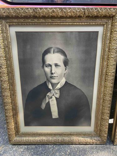 This is a fine example of a 'crayon enlargement' or charcoal solar portrait, a popular photographic/artistic hybrid from the late 19th to early 20th century. The piece depicts a middle-aged woman in a formal, high-collared Victorian dress with a prominent bow and brooch. The medium appears to be charcoal and graphite over a faint photographic base, a technique used to create life-sized portraits of ancestors. The subjects' features are rendered with soft, blended gradations typical of the era, showcasing a high level of artisanal shading. The artwork is housed in a substantial, ornate gilded gesso and wood frame featuring elaborate repeating acanthus leaf and floral vine motifs in a deep relief pattern. The frame shows characteristic signs of age, including subtle craquelure in the gesso and light oxidation of the gold leaf-style finish. The portrait is set behind a simple off-white mat. There are no immediately visible signatures or maker's marks, which is common for these studio-produced commissions. The overall construction suggests a date range between 1885 and 1910. The condition appears stable, though there is potential light foxing or silvering consistent with the age of the paper and charcoal materials. The craftsmanship of the frame is particularly high, indicating a premium display piece for its time.