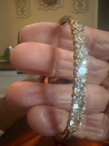 This item is a contemporary hinged bangle bracelet, likely crafted from 10k or 14k yellow gold based on the warm metallic tone visible in the setting and shank. The primary decorative feature is a graduated row of round brilliant-cut colorless stones, which may be diamonds or high-quality cubic zirconia. The stones are secured in a shared-prong setting, typical of modern fine jewelry which maximizes light entry into the pavilions for increased brilliance. The central stone is the largest, with approximately three to four stones on either side diminishing slightly in size toward the hinges. The metal work shows a polished finish with minor surface abrasions consistent with light wear. The craftsmanship appears to be of commercial quality, with uniform prongs and a classic silhouette. No specific maker's marks or hallmarks are visible in the provided image, but the overall style suggests late 20th century to early 21st century production. The condition appears sound with no missing stones or significant structural damage visible from the top view.