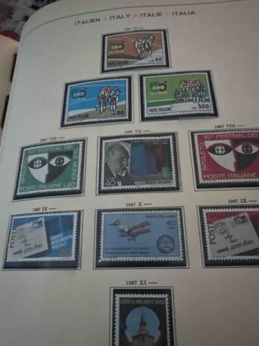 This is a collection of vintage Italian postage stamps mounted on a printed album page specifically for Italy (Italien/Italie/Italia). The collection predominantly features issues from 1967. Included are several notable commemoratives: the 10th Festival dei Due Mondi (Spoleto) stamps featuring the iconic 'Two Worlds' mask design in green and red variations; the Giro d'Italia cycling series with multi-colored backgrounds and values like 40, 90, and 500 Lire; and aviation-themed stamps commemorating the first postal flight to North Africa. The stamps are printed on perforated paper and appear to be mounted using clear protective mounts rather than adhesive hinges, which preserves the original gum. The colors remain vibrant, though some slight tanning of the underlying album page is visible, characteristic of aging paper from the mid-20th century. The condition of the stamps themselves appears to be Mint Never Hinged (MNH) or Mint Lightly Hinged, with crisp perforations and no visible surface abrasions. The album page also indicates specific months of issue in Roman numerals (e.g., 1967 VII, IX, X), denoting a highly organized philatelic collection. These items represent the mid-century modern aesthetic common in Italian graphic design of the 1960s, utilizing bold blocks of color and stylized iconography.
