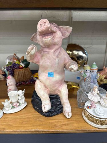 This item is a medium-sized decorative figurine depicting an anthropomorphic pig in a seated, animated pose. The figure is seated atop a dark, roughly textured base that resembles a rock or mound of earth. The pig is rendered in a realistic yet whimsical style, featuring a fleshy pink and off-white color palette with subtle variations in tone to suggest muscle and skin folds. Its snout is turned upward, its mouth is open in a wide laugh, and one fore-trotter is raised as if in a gesturing or waving motion. The material appears to be a cast resin or cold-cast ceramic, exhibiting a matte, slightly porous finish rather than a high-gloss glaze. The craftsmanship includes detailed anatomical features such as wrinkled skin around the neck and eyes, clearly defined trotters, and expressive facial molding. Regarding condition, there is visible surface wear including small scuffs and areas where the pink pigment has faded or rubbed off, particularly on the belly and limbs, revealing the lighter base material beneath. A blue inventory or price sticker is currently affixed to the center of the figure's torso. Based on the style and material construction, this piece likely dates from the late 20th century (circa 1980s-1990s) and appears to be a mass-produced collectible rather than a unique artist-signed sculpture, though it lacks visible maker's marks in this view.