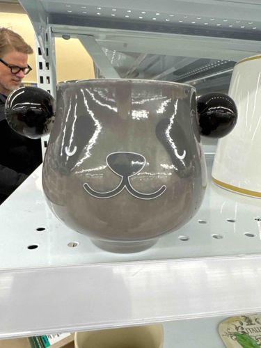 This is a contemporary ceramic vessel designed in the likeness of a stylized panda bear. The item features a bulbous, rounded body finished in a glossy taupe or brownish-grey glaze across the main surface. It is flanked by two large, protruding spherical 'ears' finished in a high-gloss black glaze. The panda's facial features are rendered using white and dark grey line work, depicting squinting eyes, a triangular nose, and a simple 'W' shaped smile. The vessel sits on a slightly tapered ring base. Physically, it appears to be a medium-sized decorative item, likely intended for use as a novelty planter or a large soup mug. The construction shows clean seams at the ear attachments, suggesting a mass-produced mold-cast origin. The glaze is remarkably reflective, showing significant catchlights from overhead fluorescent lighting, indicating a smooth, glass-like finish without visible crazing. No visible chips, cracks, or signs of wear are apparent in the image, suggesting it is in 'as-new' retail condition. The design style is modern 'kawaii' (cute) aesthetic, popular in home goods from the late 2010s to the present. There are no maker's marks visible on the exterior surfaces; such marks would typically be located on the unglazed underside of the base.