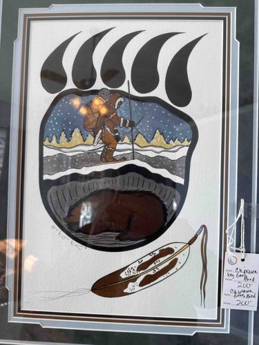 This is an original work of art on paper, signed by the Indigenous artist Gary Bird. The piece features a central motif of a large bear paw print outline. Inside the main pad of the paw, there is a narrative split-scene: the upper portion depicts a hunter in traditional winter furs trekking across a snowy landscape under a starry night sky, while the lower portion shows a brown bear hibernating in a den beneath the surface. Below the paw print, a large eagle feather is rendered with beaded accents and leather fringe. The artwork is characterized by clean line work and a palette of earth tones (brown, ochre, tan) contrasted with deep blues and whites. The piece is signed in syllabics near the bear den. It is professionally matted in a triple-layered custom mat with notched corners, featuring white, brown, and grey tones. The condition appears excellent with no visible foxing, fading, or moisture damage. A gallery tag is attached to the side, identifying the artist and mentioning 'Chippewa' heritage, which points to the Anishinaabe or Ojibwe style period of contemporary Indigenous art. The craftsmanship shows high attention to detail in the texturing of the furs and the symbolism of the seasonal cycle.