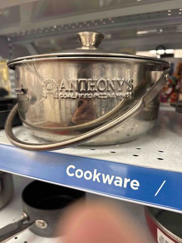 This is a polished stainless steel ice bucket featuring a distinctive embossed logo for 'Anthony's Coal Fired Pizza & Wings.' The item is constructed with a cylindrical body and a matching tight-fitting lid topped with a conical knob handle. It includes a swiveling bail handle attached via rivets on the sides for easy transport. The exterior surface has a high-shine, reflective chrome-like finish. The logo is prominently stamped into the metal, featuring an 'A' formed by a pizza oven graphic. Physically, the bucket shows significant signs of use, including numerous surface scratches, water spotting, and fingerprints that dull the mirror finish. There are visible scuffs across the front near the branding. The construction appears to be lightweight, likely modern promotional merchandise rather than professional-grade culinary equipment. The style is contemporary, dating likely from the late 20th to early 21st century, coinciding with the brand's operation. Its unique value lies in its branding as a corporate promotional piece or restaurant souvenir.
