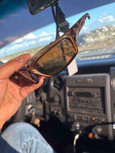 These performance-style sunglasses feature a wrap-around rectangular frame design constructed from a translucent amber-colored resin or acetate with a classic faux tortoise shell or 'root beer' mottled pattern. The frames exhibit a robust, sporty architecture with integrated thick temples designed for a secure fit during physical activity. The lenses appear to have a warm brown or amber tint, which is typically utilized to enhance contrast and depth perception in outdoor environments. Regarding condition, the lenses show significant visible wear, including a prominent diagonal crack or deep scratch on the right lens (viewer's left) and various surface abrasions across both lenses, likely impacting visibility and optical clarity. The frame material displays a high-gloss finish, although slight dulling and surface scuffs are consistent with heavy utility use. While no branding is immediately legible on the exterior temples in current lighting, the hardware and bridge design suggest a mass-market contemporary manufacturing period, likely within the last 10-15 years. The construction quality is medium-duty, prioritizing durability over luxury detailing, suited for high-glare environments like driving or fishing.
