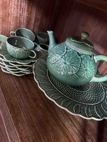 Bordallo Pinheiro Geranium Leaf Majolica Tea Set