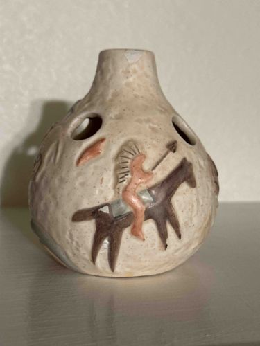This is a small, bulbous pottery vessel featuring a textured, light-tan slip surface and decorative sgraffito and relief work. The piece is constructed from ceramic clay with a narrow neck and wide, rounded body. The central motif depicts a simplistic relief figure of an Indigenous warrior on horseback, wielding a spear or bow. The warrior is rendered in a soft peach/terracotta hue, while the horse is a contrasting dark chocolate brown. Notable features include several small circular piercings at the shoulder of the vessel and a distinct hammered or dimpled texture across the exterior. The application of color appears to be a matte glaze or slip wash, consistent with 20th-century Southwestern American pottery styles. Regarding condition, there is a prominent chip or loss of surface slip located on the upper neck near the rim, exposing the lighter ceramic body beneath. There is also general surface wear and some scuffing visible on the lower section of the horse motif. This piece likely dates from the late 20th century and mimics traditional Puebloan storytelling pottery through more modern manufacturing techniques.