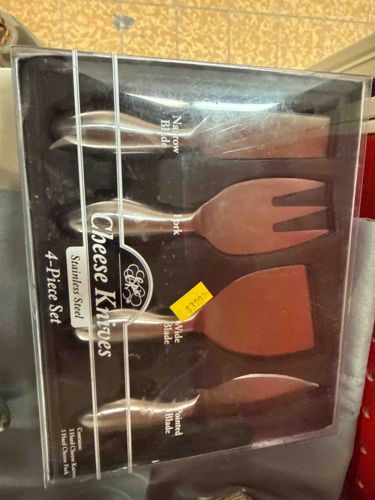 This is a boxed 4-piece specialty cheese knife set crafted from stainless steel with a brushed or satin finish. The set includes four distinct tools designed for various types of cheese: a narrow blade for semi-hard cheeses, a three-pronged cheese fork for serving, a wide blade (chisel) for crumbly hard cheeses, and a pointed blade (heart-shaped) for breaking off chunks of hard cheeses like Parmesan. Each tool features a solid, ergonomic handle with an integrated bolster for a seamless look, suggesting easy maintenance and hygiene. The items are presented in a black flocked tray within a black and clear acetate retail box featuring the brand logo 'Epic' in a script font. The packaging includes white text identifying each tool. Based on the contemporary design and packaging materials, this set is estimated to be from the early 21st century. The condition appears to be new-old-stock as it is still in the original retail packaging with an old yellow price sticker attached. The construction is robust for kitchenware, targeting a consumer market looking for functional yet stylish entertaining accessories. No major structural damage is visible, though the outer packaging shows minor scuffing typical of storage.