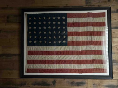 Historical 48-star United States flag, commonly associated with the period between 1912 and 1959. This specific flag is professionally mounted and displayed in a dark, wide-profile wooden frame with a white surrounding mat. The flag features a blue canton with eight horizontal rows of six stars each, all executed in a symmetrical grid pattern. The thirteen alternating red and white stripes are constructed from joined fabric segments rather than being printed, indicating a higher quality of traditional textile construction. The stars appear to be machine-stitched or appliquéd, with a slight cream or off-white patina consistent with natural aging. Notably, the hoist (the left edge) features a reinforced canvas header with visible brass grommets, suggesting this was a functional outdoor or shipboard flag before being preserved. The textile shows significant signs of age and historical use, including horizontal and vertical fold lines from long-term storage, moderate yellowing of the white stripes and stars, and slight fading of the indigo and madder-red pigments. There are minor textural irregularities in the weave of the fabric, likely wool bunting or a heavy cotton blend. The overall condition is good for its age, exhibiting a desirable antique patina without major tears or shredding. The 48-star configuration makes it a significant piece of World War I, World War II, and Korean War era military and domestic memorabilia.