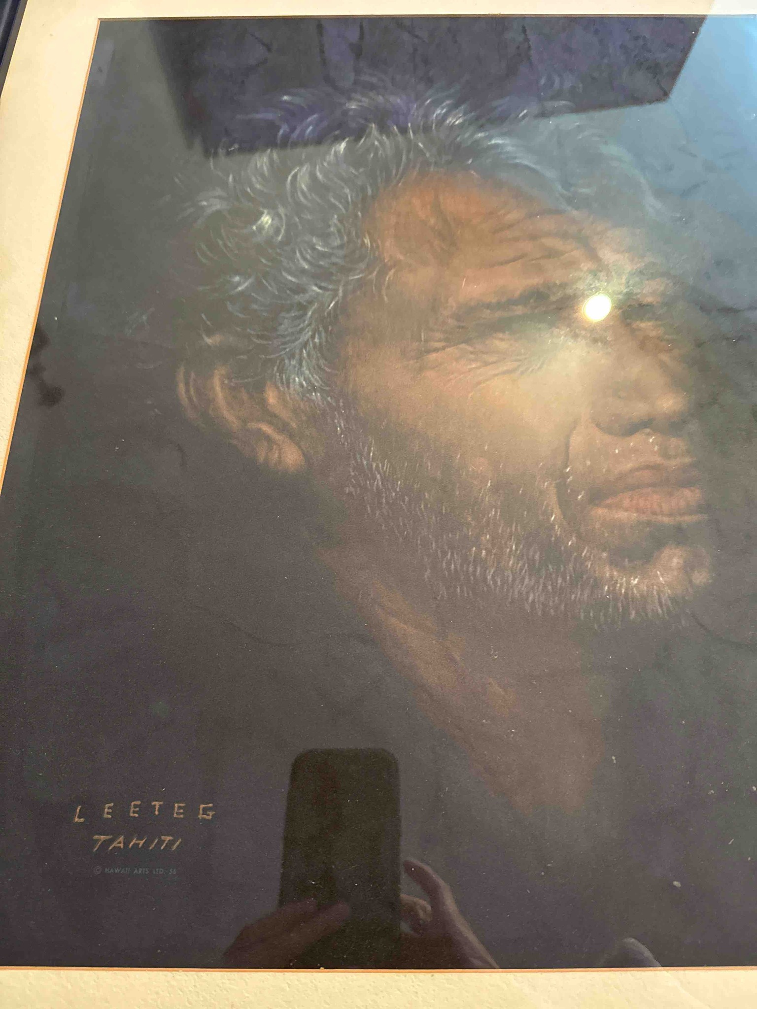 This item is a framed reproduction of a black velvet painting by the renowned American artist Edgar Leeteg (1904–1953), often considered the father of modern black velvet art. The portrait depicts a Tahitian man in a dramatic, high-contrast composition typical of Leeteg's mid-century South Pacific series. The figure is rendered with great detail in the face, showing weathered skin, white-flecked beard, and expressive, lifelike eyes against a deep, dark violet-black background. The print is marked in the lower left corner with 'LEETEG TAHITI' followed by '© HAWAII ARTS LTD. 55', which identifies it as a vintage commercial reproduction produced after the artist's death, specifically dating to circa 1955. The image is housed behind glass in a wooden frame with a light-colored mat board. Physically, the piece shows some signs of age-related wear, including minor dust under the glass and potential fading of the original vibrant hues. The craftsmanship of the original work is translated through the print, capturing the characteristic 'glow' that Leeteg achieved by painting directly onto velvet fabrics, a technique that revolutionized the medium in the 1930s and 40s.