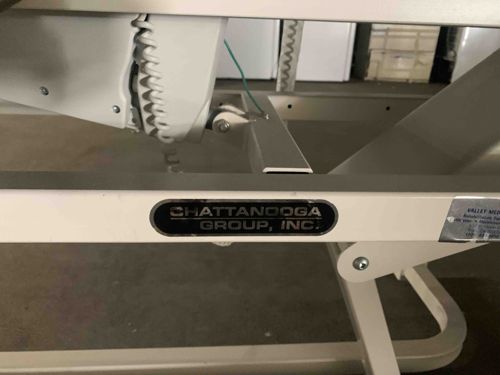 This is a heavy-duty professional electric treatment or physical therapy table manufactured by Chattanooga Group, Inc. The frame is constructed from high-grade, powder-coated tubular steel in an off-white or cream finish. A central identification oval nameplate 'CHATTANOOGA GROUP, INC.' is prominently displayed on the side rail. Adjacent to it is a silver service or inventory sticker from 'VALLEY MED'. The image shows a complex mechanical undercarriage featuring an electric actuator motor housed in a protective white casing, connected to a coiled power cable. The system utilizes a scissor-lift or parallelogram mechanism for height adjustment, secured with heavy-duty hex bolts and pivot points. A thin green grounding wire is visible, suggesting a motorized electronic component. The construction indicates a medical-grade standard designed for weight-bearing therapy sessions. The condition appears to be used but well-maintained; there is typical minor cosmetic wear on the steel frame and some dust accumulation in the mechanical joints, but no signs of structural failure, deep rust, or hydraulic leaking are visible. This model likely dates from the late 1990s to the 2010s, a period when Chattanooga Group was a leader in rehabilitative equipment.