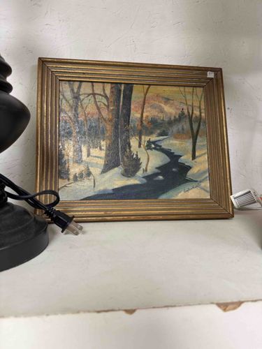 This item is an original oil painting or high-quality lithographic print on canvas/textured board, depicting a serene winter forest landscape. The composition features a winding, dark blue stream cutting through a snow-covered valley, flanked by bare deciduous trees and evergreen shrubs. In the background, rolling hills or low mountains are visible under a pale, overcast sky rendered with soft pink and yellow hues, suggesting either dawn or dusk. The artistic style is reminiscent of early-to-mid 20th-century American impressionism, characterized by soft brushwork and a muted, naturalistic color palette. The piece is housed in a carved wooden frame with a gilded or gold-painted finish, featuring a tiered, linear 'reeding' profile that draws the eye toward the center. A signature is visible in the lower right-hand corner, though it is slightly obscured and requires closer inspection to definitively identify the artist. Regarding condition, the frame exhibits significant aesthetic wear, including scuffing, thinning of the gold leaf along the edges, and visible dust accumulation in the crevices. There is a small price tag or inventory sticker on the upper right corner of the frame. The artwork itself shows signs of aging such as slight yellowing of the varnish and some surface grime, which is consistent with its mid-century vintage. Overall, the craftsmanship reflects a professional hand, likely intended for a domestic gallery or personal collection during the 1940s-1960s.