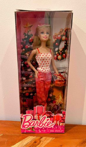 This is a Mattel Barbie doll, specifically a holiday-themed pajama edition, likely released circa 2011-2013 as part of a seasonal budget or grocery line. The doll is presented in its original retail window box packaging. Barbie features long blonde hair with a pink sleep mask resting on her head. She is dressed in a two-piece pajama set consisting of a white sleeveless camisole top with a red heart-shaped or floral pattern and red-and-pink plaid pajama pants featuring snowflake motifs. The doll is holding a small red wrapped gift accessory. The cardboard backdrop inside the box depicts a festive holiday scene with a decorated Christmas tree and a wreath. The packaging shows moderate shelf wear, including visible creasing on the upper right corner and some minor scratching on the plastic window, though the doll itself appears to be in 'Never Removed From Box' (NRFB) condition. The bottom of the box features the iconic pink Barbie logo with holiday graphics like presents and holly.