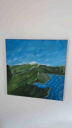 This item is an original landscape painting titled 'Prairie à la mer' (Meadow by the Sea) attributed to the artist Chaban, dated July 23, 2025. The artwork is executed on a square canvas measuring approximately 42.0 x 59.4 cm (A2 scale). The composition features a vibrant coastal landscape characterized by rolling green hills and a deep blue sea. The artist employs a palette of earthy greens, forest shadows, and various shades of cerulean and cobalt blue. The brushwork appears expressive and somewhat impressionistic, with visible texture in the sky and the rolling terrain. The sky occupies the upper half of the canvas, depicted with swept white highlights suggesting movement or clouds. The condition appears to be excellent and representative of a contemporary work, with sharp edges and no visible signs of fading, cracking, or surface abrasions. The canvas is unframed, showing the painted edges which suggests a modern gallery-wrap style of presentation. The craftsmanship indicates a purposeful use of color to define depth, particularly in the contrast between the sunny meadow peaks and the shaded valleys leading down to the water's edge.