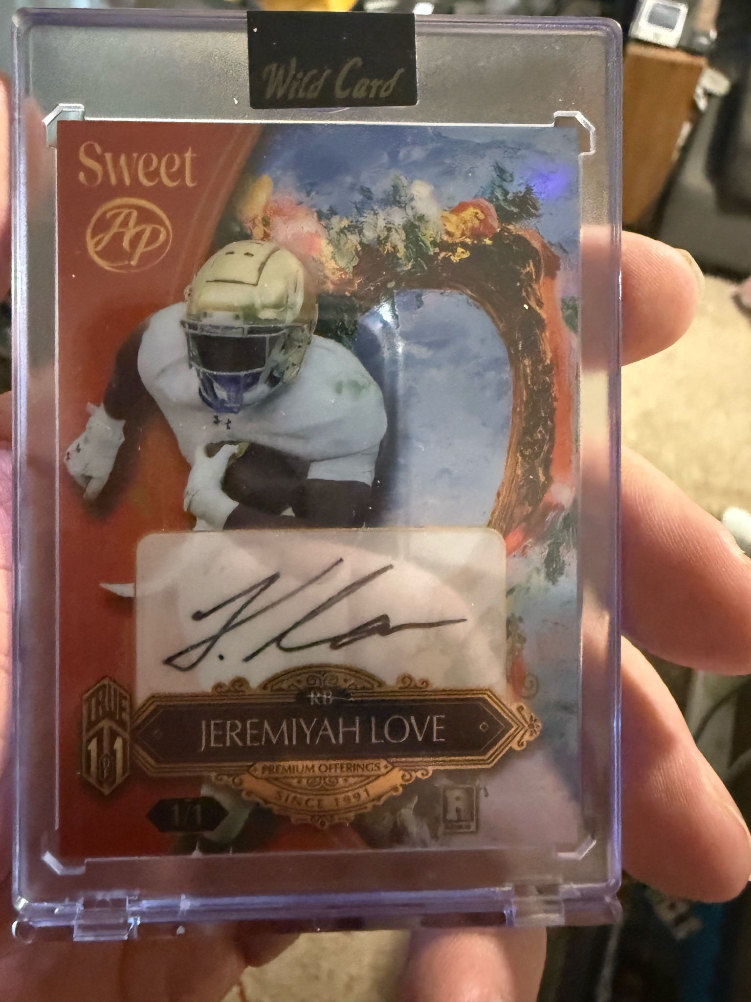 This is a premium, one-of-a-kind (True 1/1) modern sports trading card featuring running back Jeremiyah Love. The card is produced by 'Wild Card' for their 'Sweet AP' (All-Purpose) collection. The design features a distinctive artistic aesthetic, blending a high-action sports photograph with a classical oil-painting-style floral background. A major highlight is the authentic bold black ink autograph located on a centered sticker window. The card construction includes a thick stock with multi-layered graphics, gold-foil lettering, and a 'True 1/1' holographic gold foil stamp on the bottom left. The player is depicted in a white jersey and gold helmet, characteristic of the Notre Dame Fighting Irish. The card is housed in a clear protective magnetic one-touch case with a 'Wild Card' branded security seal at the top. Condition appears to be 'near mint to mint' (NM-MT) as viewed through the case, with sharp corners and vibrant color saturation. The manufacturing details include 'Premium Offerings Since 1991' and specialized logo emblems. This specific card represents an extreme rarity in the modern card market due to its unique serial numbering.