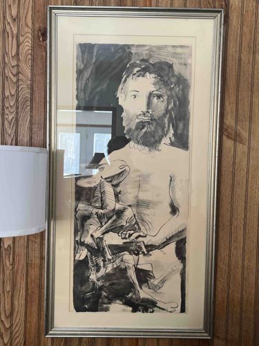 This item is a large-format monochromatic lithograph, an after-work based on Pablo Picasso’s famous 1943 sculpture and subsequent 1967 ink wash drawings. The composition depicts a bearded, muscular man holding a lamb, rendered in a striking gestural style using black ink and grey wash tones. The artwork displays characteristic Mid-Century Modern aesthetics with strong, expressive lines and anatomical stylization typical of Picasso's later period. The piece is housed in a contemporary silver-toned metallic frame with a double mat in cream and off-white. The paper appears to be a heavy woven stock consistent with mid-to-late 20th-century art reproductions or lithographic editions. The condition shows minor signs of aging; there is slight yellowing or toning of the paper stock and minor scuffing on the frame edges. No visible foxing or water damage is present, though some reflection in the glazing indicates it is likely framed under standard glass. The scale is significant, appearing to be a full-length vertical presentation. Such pieces were often part of high-quality limited editions released by major art houses like Mourlot in Paris during the 1960s and 70s.