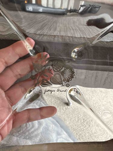 This item is a clear bent glass serving tray or dish featuring the distinct Mid-Century Modern design aesthetic of Georges Briard. The piece is constructed from clear, slumped glass with elegant curved edges. Centrally located on the bottom (and visible through the glass) is a signature floral or botanical motif screen-printed in a metallic gold or silver-tone finish. This motif includes stylized leaves, floral buds, and abstract circular patterns typical of Briard's 1950s-1960s production. Immediately below the illustration, the copyrighted signature 'georges Briard' is clearly visible in a cursive script. Physically, the tray appears to have three or four integrated glass feet formed by slumping the glass during production. The tray is in good vintage condition, exhibiting high clarity in the glass without immediate signs of chips or deep cracks, though minor surface scratches and faint oxidation to the metallic ink are consistent with its age. The craftsmanship is indicative of high-quality mid-century decorative arts, blending industrial glass techniques with hand-designed graphic elements. This piece represents the 'boutique' mass-market luxury that Briard was famous for during the mid-20th century.
