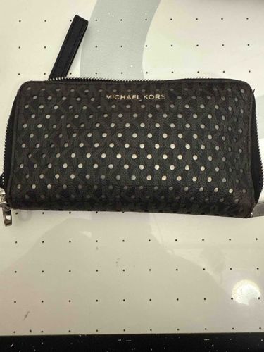 This is a Michael Kors zip-around continental wallet, crafted from black leather featuring a distinct perforated 'MK' logo pattern. The exterior showcases a repetitive circular perforation design that creates a geometric monogram effect, revealing a lighter metallic or contrasting interior layer beneath. Centered near the top edge is a polished gold-tone 'MICHAEL KORS' metallic logo plaque. The wallet is constructed with a full three-sided zip-around closure utilizing a silver-tone metal zipper and a leather pull tab. In terms of dimensions, this is a standard large continental size, typically measuring approximately 8 inches in length and 4 inches in height. Regarding condition, the item shows visible signs of moderate use. There is noticeable wear along the piped edges and corners where the leather has scuffed or thinned, particularly on the right side. The leather surface appears somewhat softened or misshapen from use, and there is slight discoloration or tarnishing visible on the metal zipper hardware. The overall craftsmanship reflects a contemporary designer accessory from the mid-2010s, characterized by reinforced stitching and mass-market luxury materials.