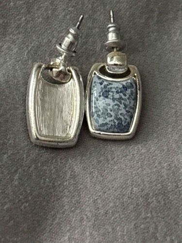 This lot contains a pair of vintage fashion earrings featuring a rectangular 'door knocker' or drop style design. The earrings are constructed from a silver-toned base metal, possibly brass or alloy with a rhodium or nickel plating. Each earring includes a central decorative panel with a mottled blue and grey finish, evocative of natural stones like dalmatian jasper or a granite-style drip enamel glaze. The metal frames exhibit a brushed or textured finish on the reverse side, a common mark of costume jewelry from the late 20th century, approximately the 1980s or 1990s. The earrings utilize post-and-butterfly clutch closures. Condition-wise, the plating appears mostly intact with minor surface scratches and slight oxidation near the hinges. No clear maker's marks are visible on the reverse, suggesting mass-market production. One earring is flipped to show the textured metallic back, while the other displays the smooth, high-gloss decorative inlay. The overall craftsmanship is consistent with mid-range costume jewelry designed for everyday wear.