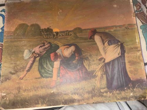 This item is an antique or vintage lithographic color print depicting the famous 1857 oil painting 'The Gleaners' (Des glaneuses) by Jean-François Millet. The artwork shows three peasant women laboring in a field to glean the remains of a wheat harvest under a setting sun. The print is rendered on a stiff paper or board substrate and measures approximately medium-sized, likely intended for home decoration. The color palette features earthy tones of gold, ocher, and muted blues and reds, typical of 19th-century Realism. The condition of the piece is fair to poor, showing significant age-related wear. There are visible white scuffs and scratches across the surface, particularly in the upper sky area and bottom edge, indicating loss of the printed surface. The corners are severely bumped and frayed, and there is a noticeable vertical crease or tear on the right edge. No artist signature or specific printer's mark is visible in the provided image, though such mass-produced prints often originated from early 20th-century lithography houses. The style exemplifies Rural Realism, focusing on the dignity of manual labor. The heavy patina and edge damage suggest the piece has been storage-worn or handled without a frame for an extended period.
